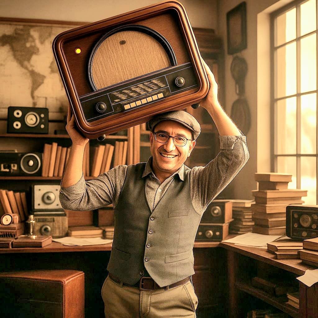 בתמונה – אני עם שינוי בפנים אחרי המעבר במכונת הזמן אל הסטודיו של שנת 1930, מנסה לשדר את הסיפורים ברדיו במקומי…